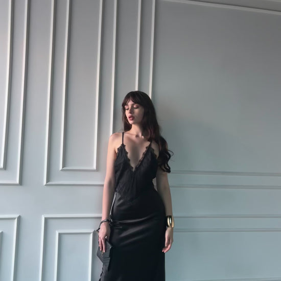BELLE Slip Dress in Black. Chic but classy. Plunging neckline gives it that sexy edge. Timeless piece that can transfer over to each season. Low cut back. Adjustable straps to bring up the neckline & back. All hardware is gold. Lovely lace panel in the front and lace trim details. Hits right above the ankle to see your strappy heels or pair it with some boots!